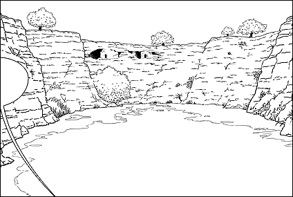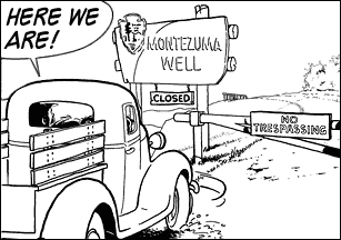 To write and draw a series like Arizona, you need two types of research: factual research and visual research. The factual research deals with the history of the people and their cultures, the types of animals and plants found in Arizona, the geography and history of the state, and much more. Visual research consists in finding images of what you are about to draw. In the pilot episode, "Deep in Montezuma," since most of the action takes place at the Montezuma Well National Monument, the comic artist, Mac McCool, went on location to shoot photos of the Montezuma Well itself (see below). Additionally, he researched the web for information on the history of the well, the 1937 Chevy pick-up Pops drives, the roadrunner appearing on the first page, photos of the moon and of petroglyphs (drawings on rocks), and other details, such as the color scheme of the 1984 Los Angeles Olympics, which served as an inspiration for the color palette of Arizona. Here are some links and photos!